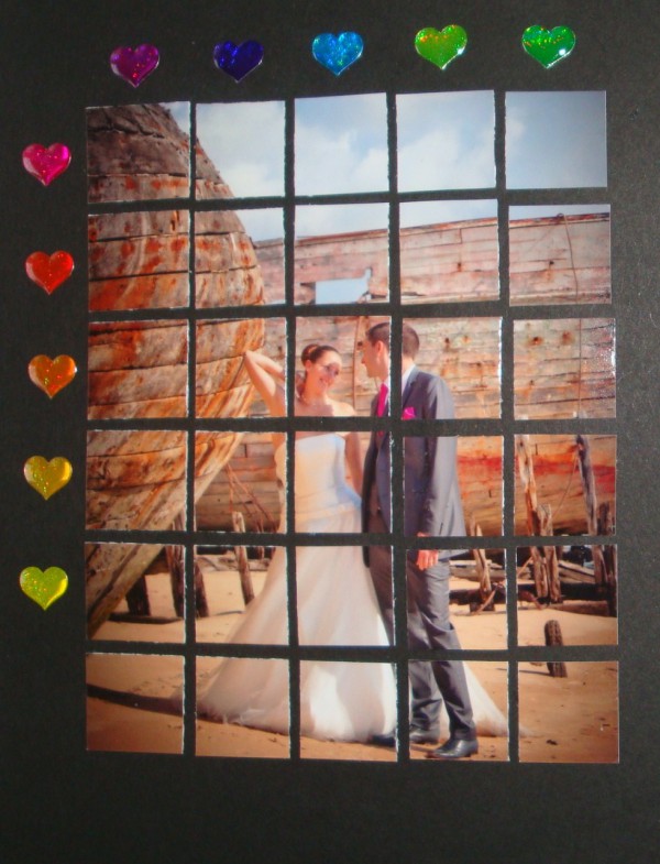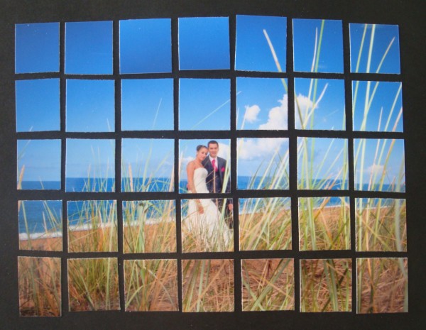 Passez votre photo dans le massicot, lame droite ou lame fantaisie. Coupez d'abbord les lamelles puis dans les lamelle coupez des carrés.
